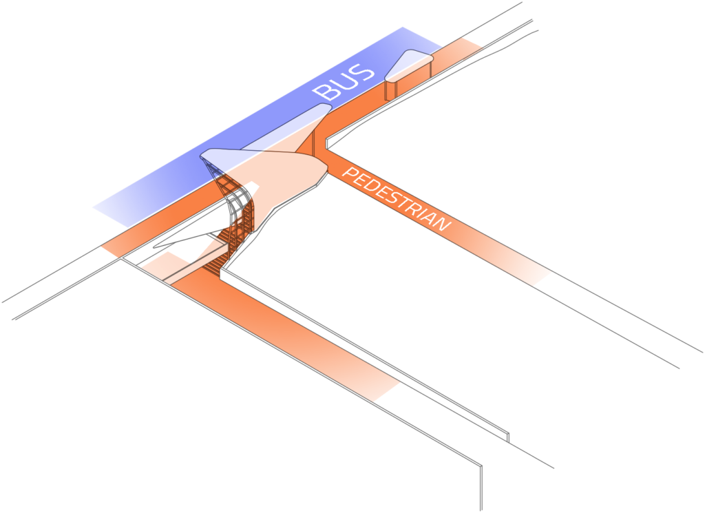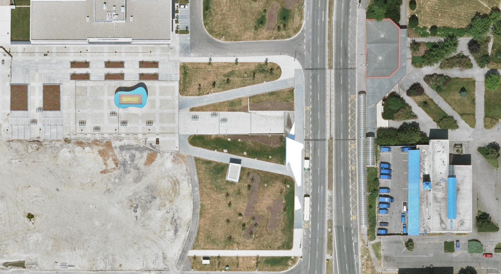The proposed bus stop complements the imaginary axis composed of various objects (metro exits, greenery, statue, small firehouse, …) on the square between residential and office buildings and with its spatial and material conception highlights the diversity of the buildings on this axis.