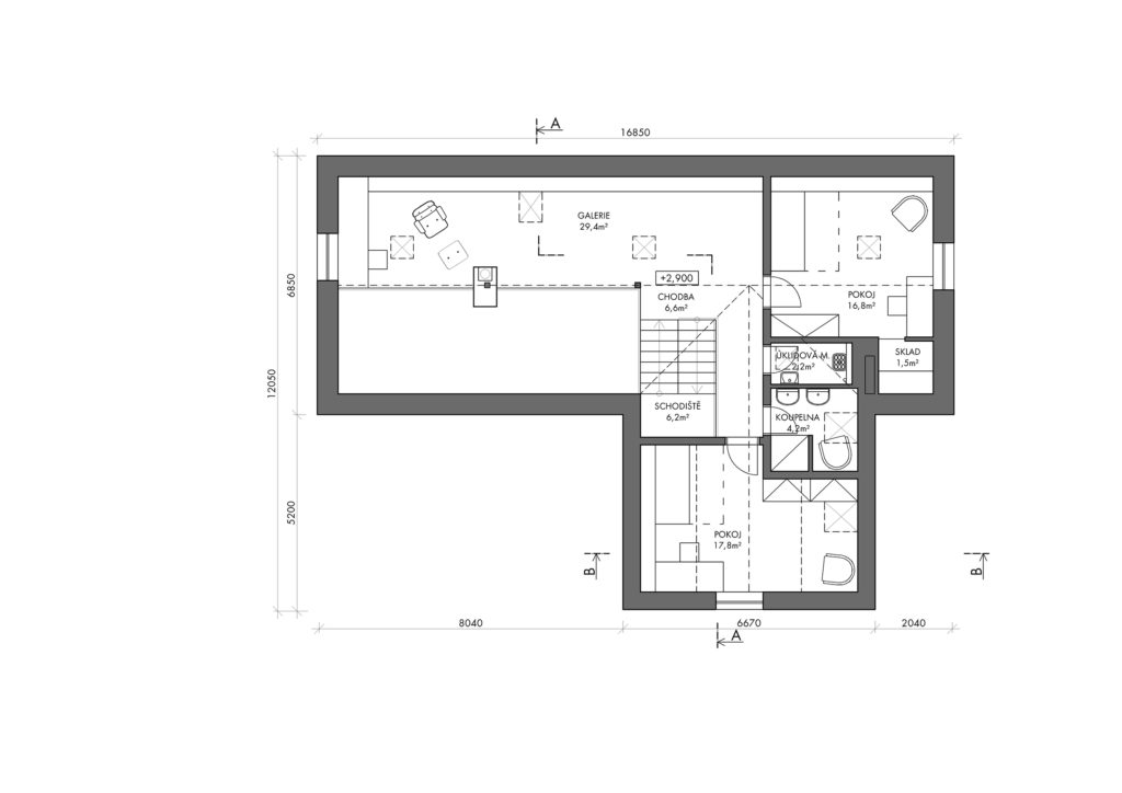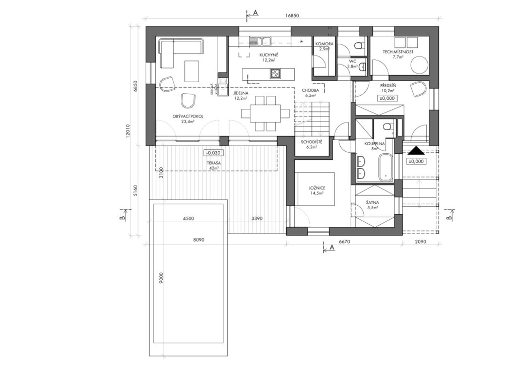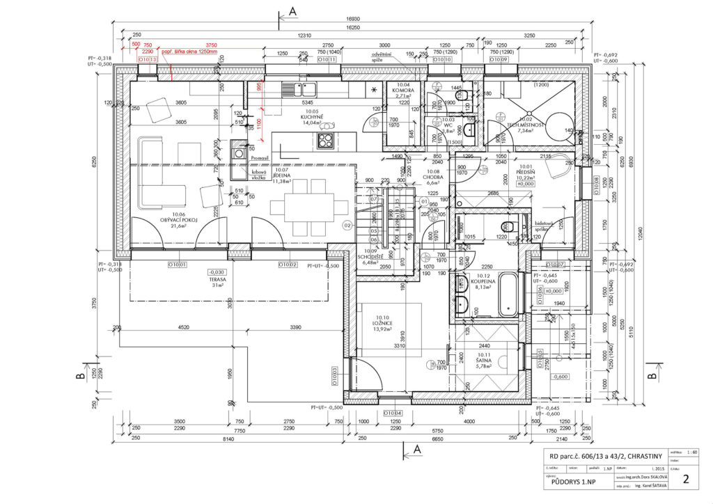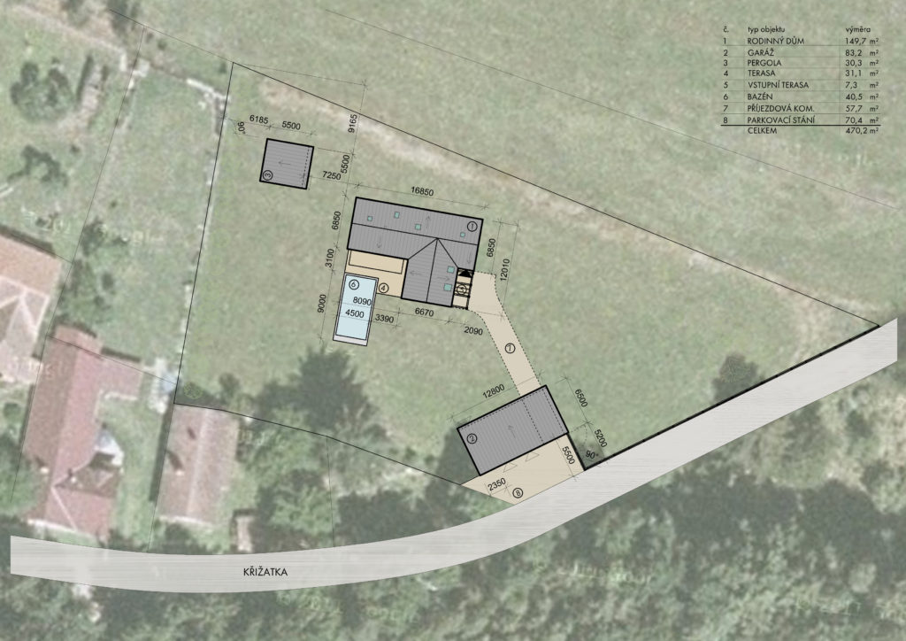 The family house is located near the town of Chrastiny on a hill next to a forest and a horse farm with pasture land all around the plot. The plot holds, next to the house, a garage for two cars and a pergola with an outside kitchen, a toilet, and garden storage.