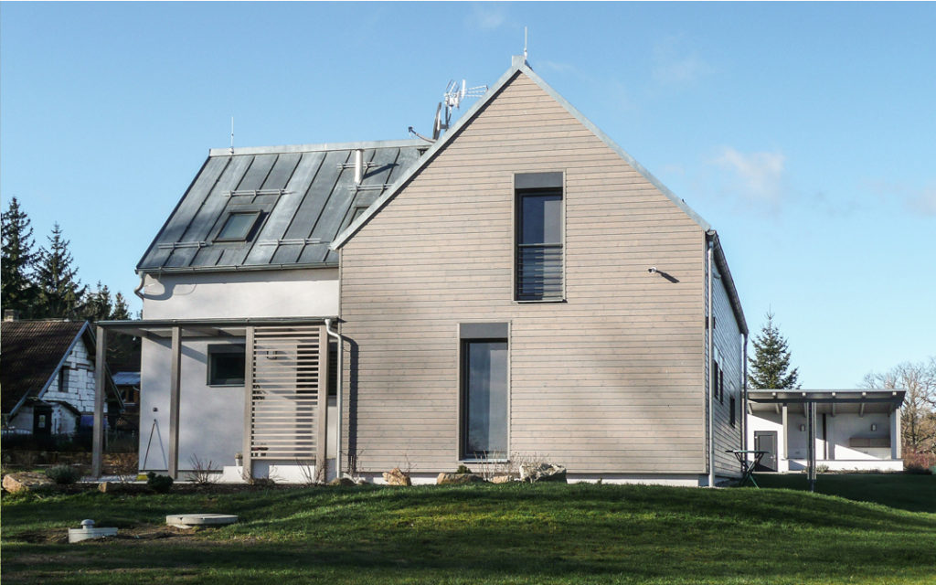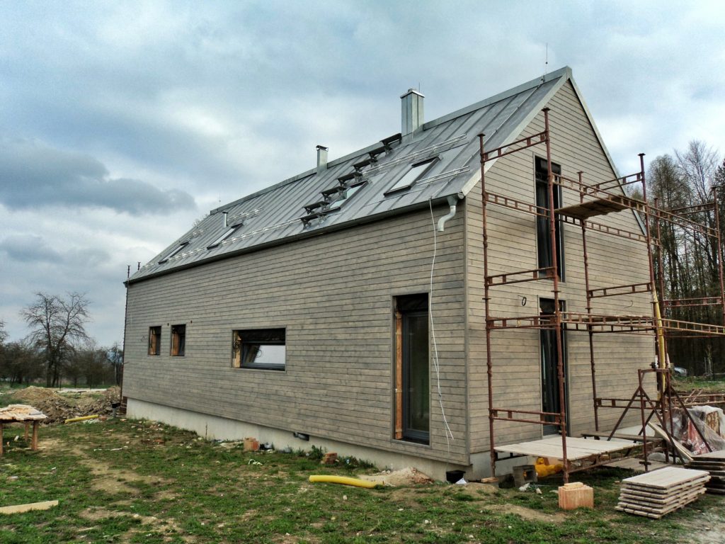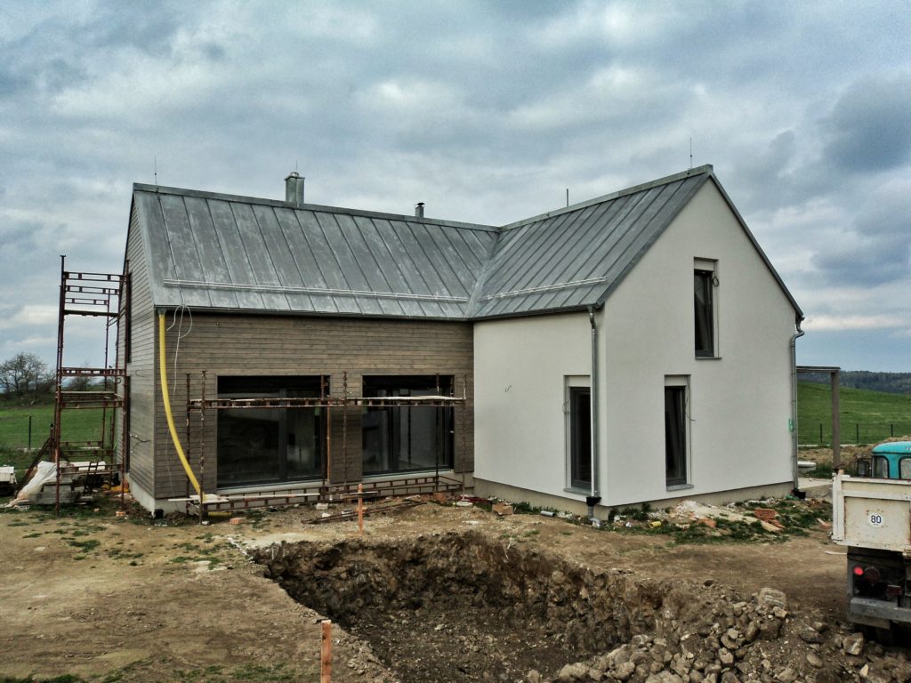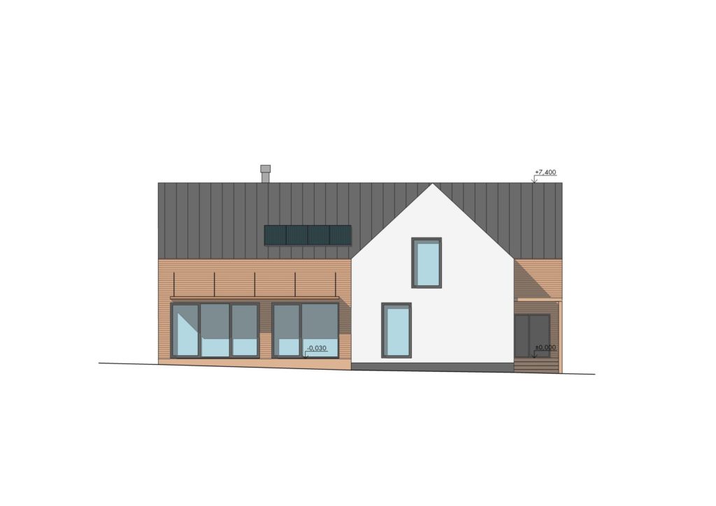 The concept of the family house is based on a dialogue between the old rural and Czech contemporary architecture. This dialogue is reflected in the material use and the volume arrangement. Particularly, the traditional is represented by the white facade with a south-oriented gable and the wooden facade, perpendicular to the white one, represents the new. This orientation is also more beneficial due to the heat gain from the sun.