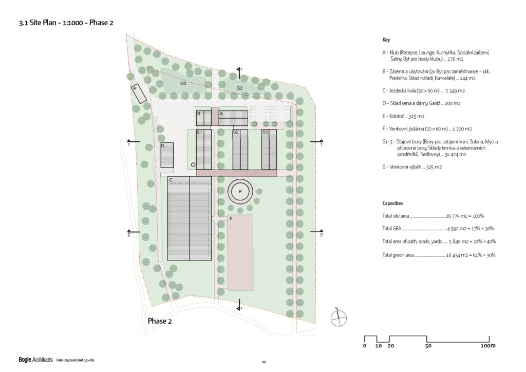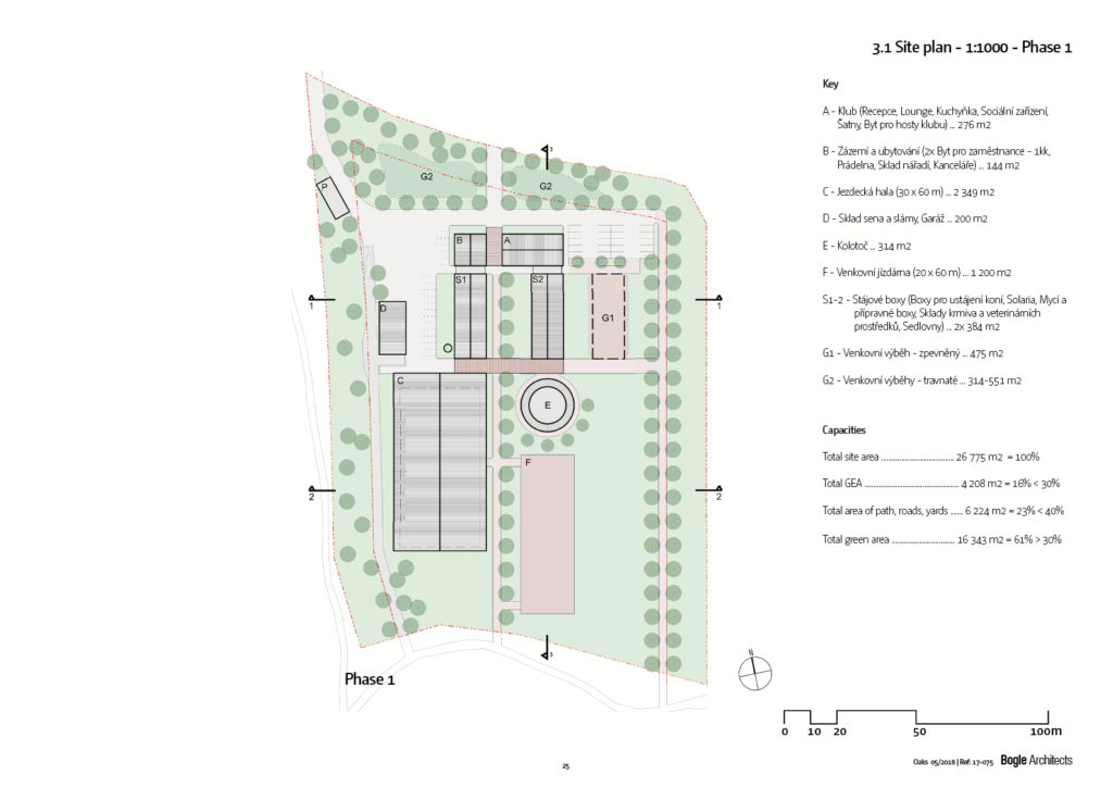 The critical factor in designing the equestrian center was the placement of individual buildings in the terrain and in relation to their functions with a focus on the short walking distance between them. The project consists of a club with a reception and changing rooms, a house for staff with an office and manager’s apartment, stables for 54 horses, an indoor arena, an outdoor arena, a horse walker, and paddocks. All crucial horse services are placed along one path.